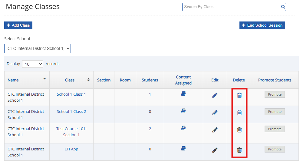 (Note: A class rostered on the portal through a third-party integration, like One Roster, Google classroom, LTI, etc cannot be deleted via the platform UI. These classes can only be deleted by the third-party integration mechanism.)
