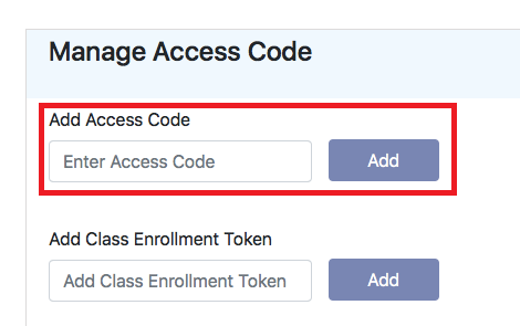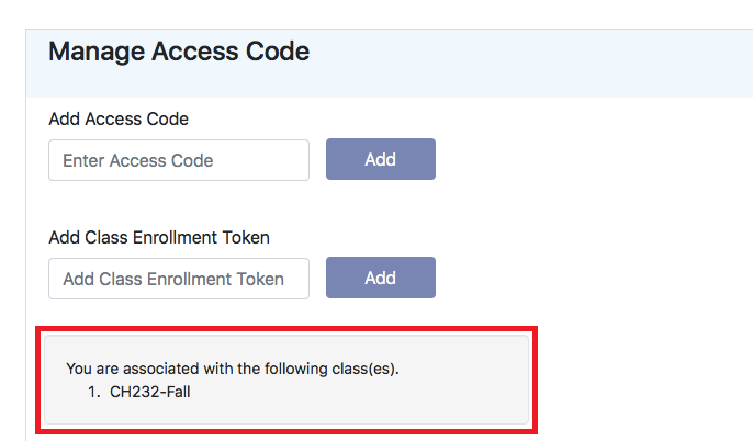 In the Add Access Code field, paste your new access code and click the Add button. You will see your new book(s) on your dashboard. If these new materials are for your current class, you can stop here. If your new books are for a different class, proceed to step 3.