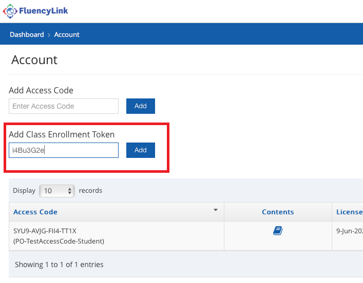 In the Add Class Enrollment Token field, paste the token you received from your instructor and click the Add button.