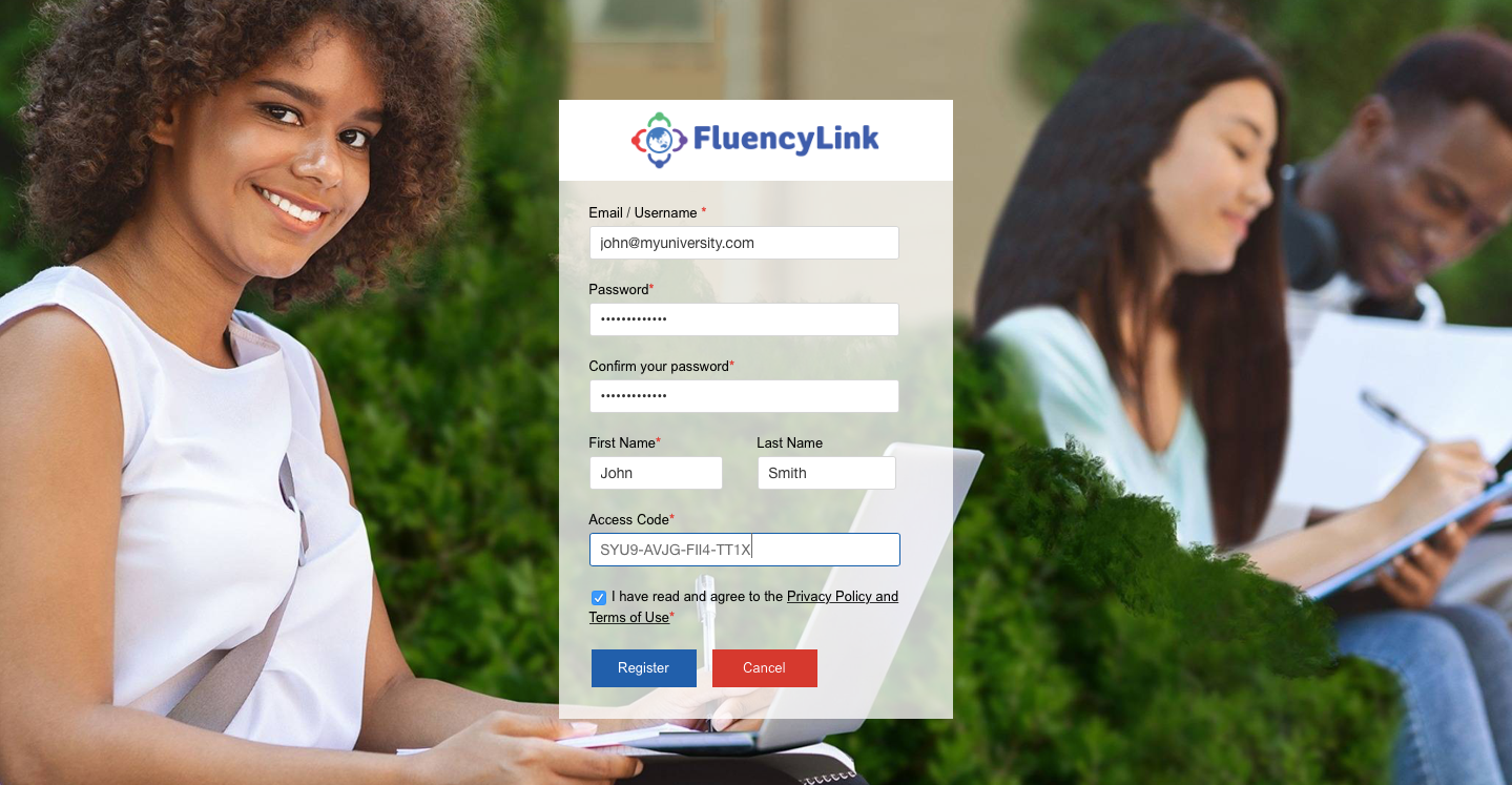 This access code is required to register a new user account on fluencylink.com. Once registered, this access code will also unlock the books and any other materials associated with your license.