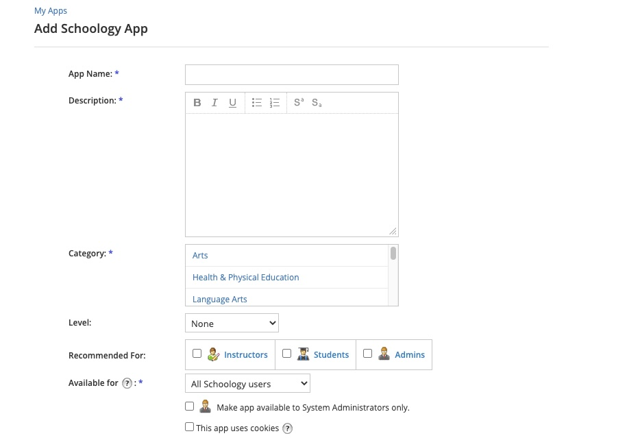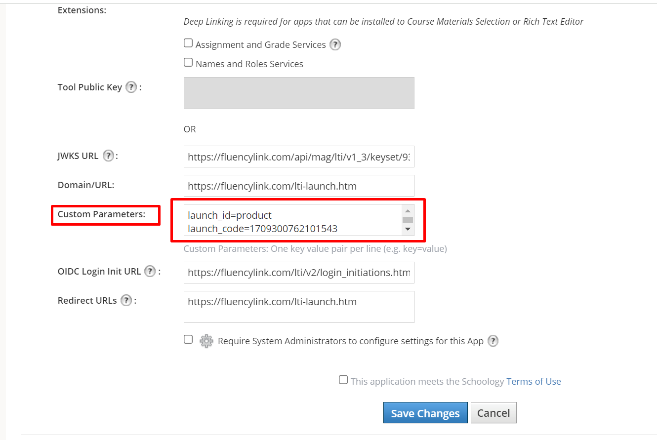 - Users can add custom parameters for the product launch during the Schoology App's setup by using the Schoology Dashboard: