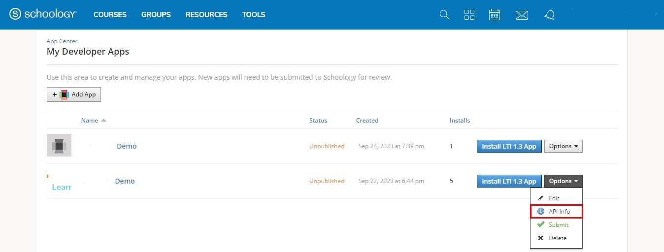 Review LTI Apps Developer Documentation at https://developers.schoology.com/app-platform/lti-apps