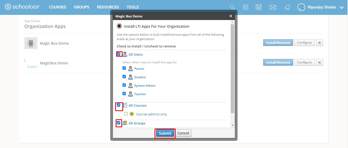 - Check the below boxes for All Users, all courses, and All groups and click submit.