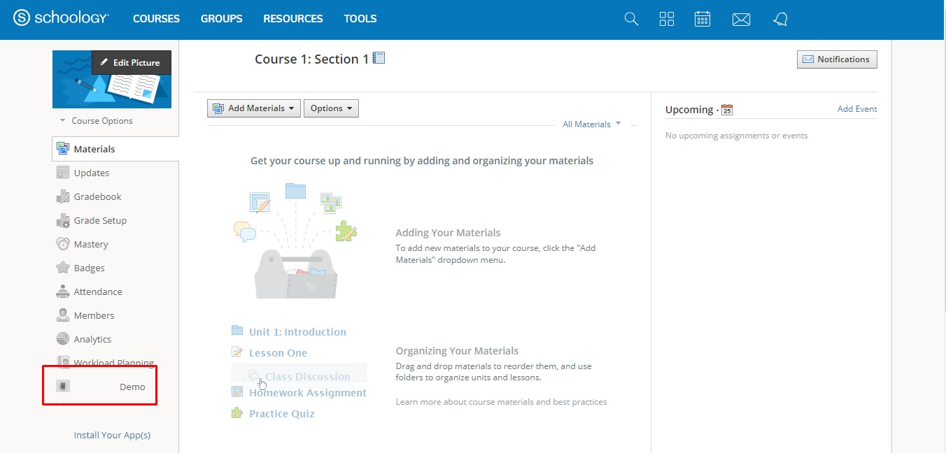 - When the user goes to the Schoology app one can navigate through the courses and launch the user from Schoology as below: