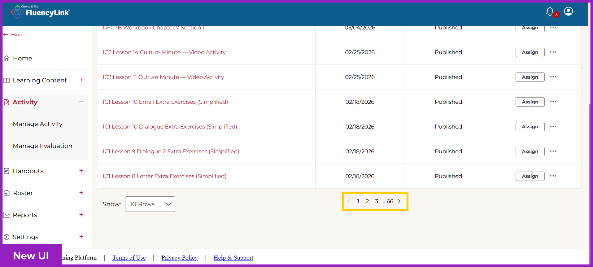Your Activities (or Question Bank) display on pages instead of an endless scroll. You can also adjust the number of results per page: 10, 15, or 20.