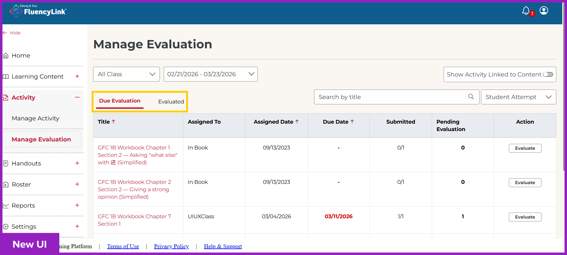 Separate Due Evaluation and Evaluated tabs help keep your grading organized.