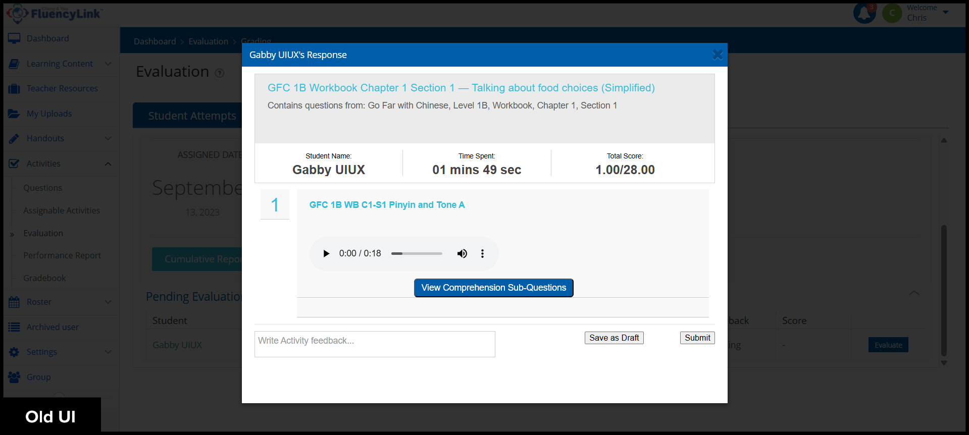 The new Evaluation interface is larger for viewing student responses/grading, and the sub-questions are pre-expanded.